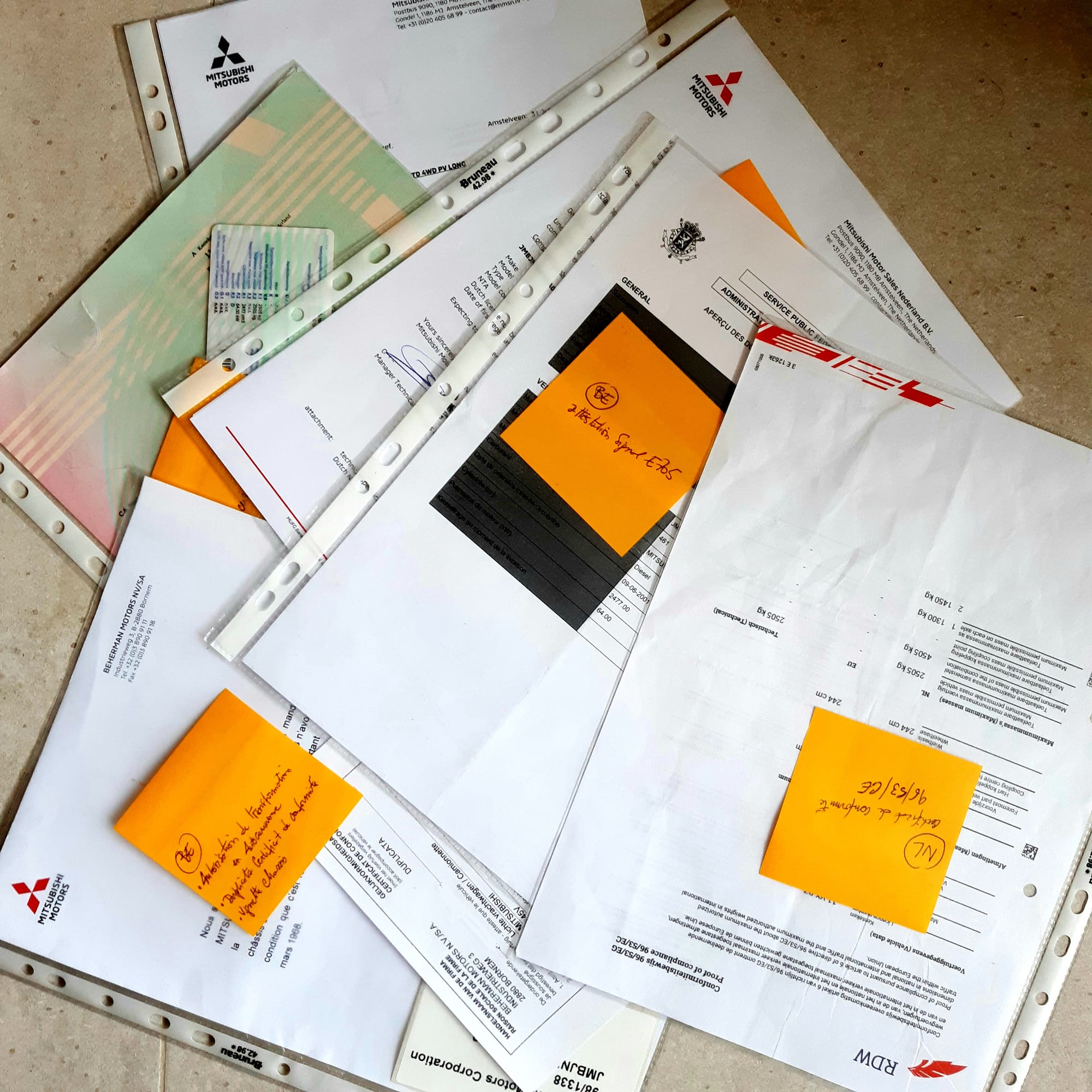 Outre le signal E705 à introduire auprès de l'administration générale des douanes et accises, une première action a été naïvement d'écrire à Mitsubishi Motors Nederlands pour obtenir un duplicata du certificat de conformité européen.